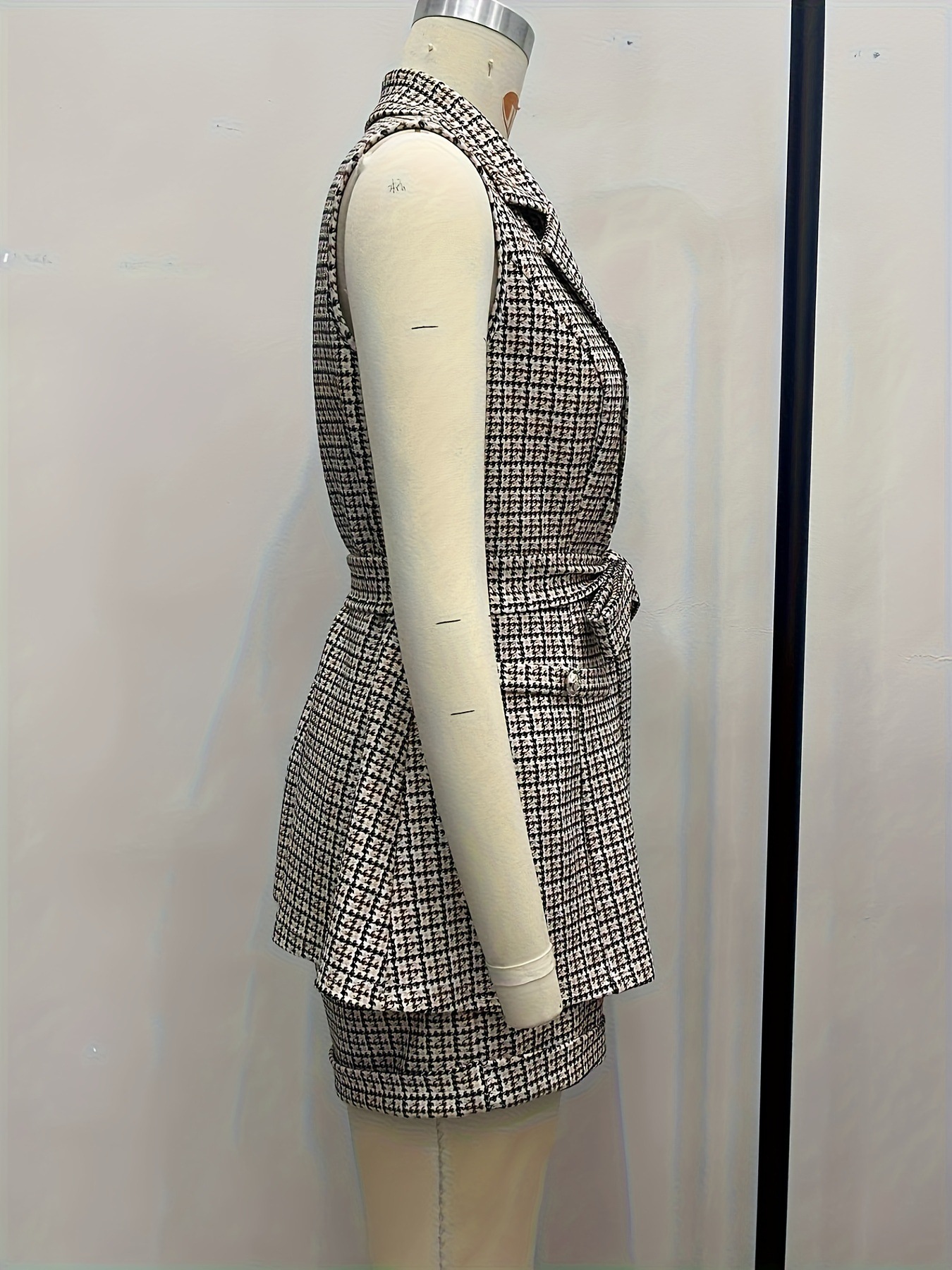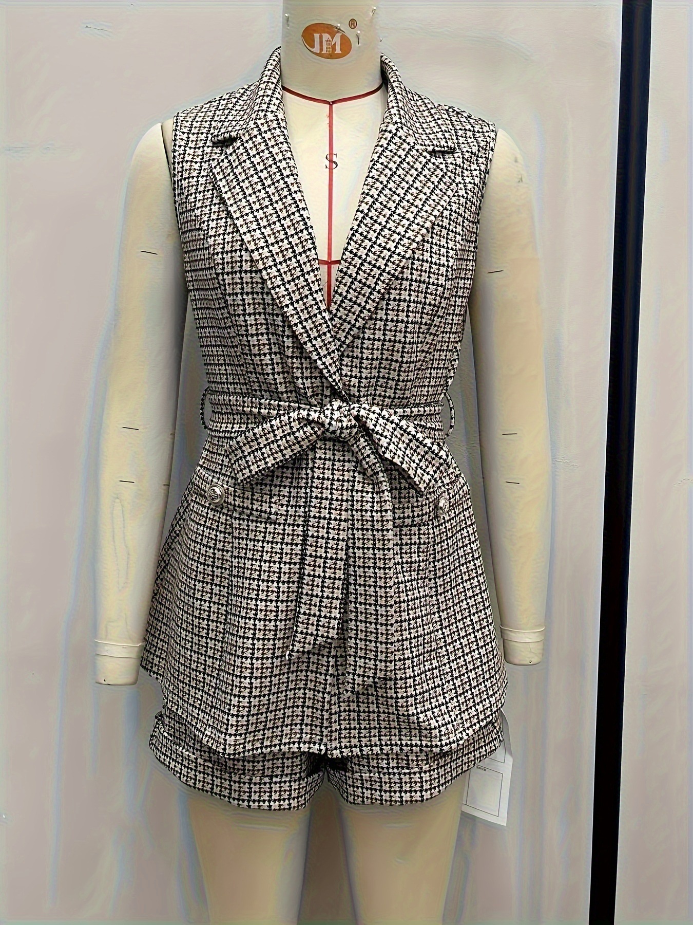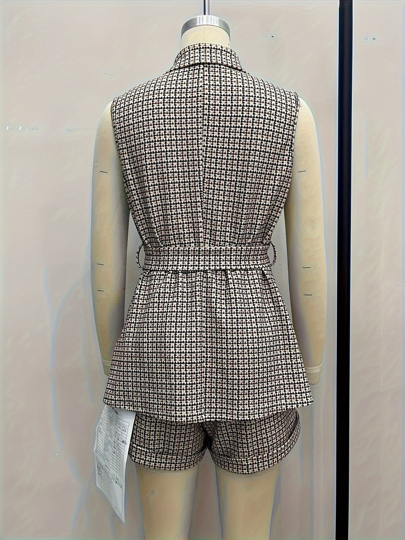 Autumn Winter Elegant Collared Knitted Houndstooth Vest Shorts Two Piece Sets