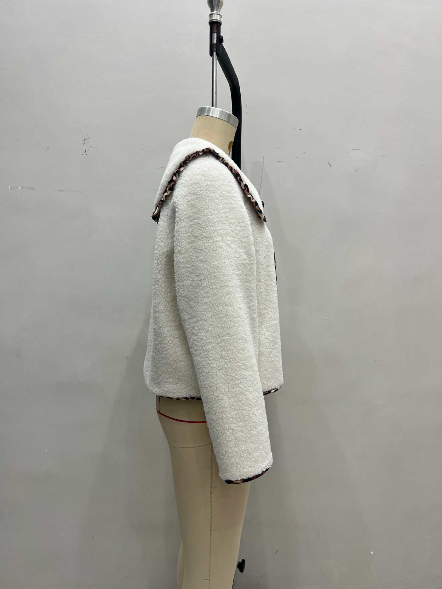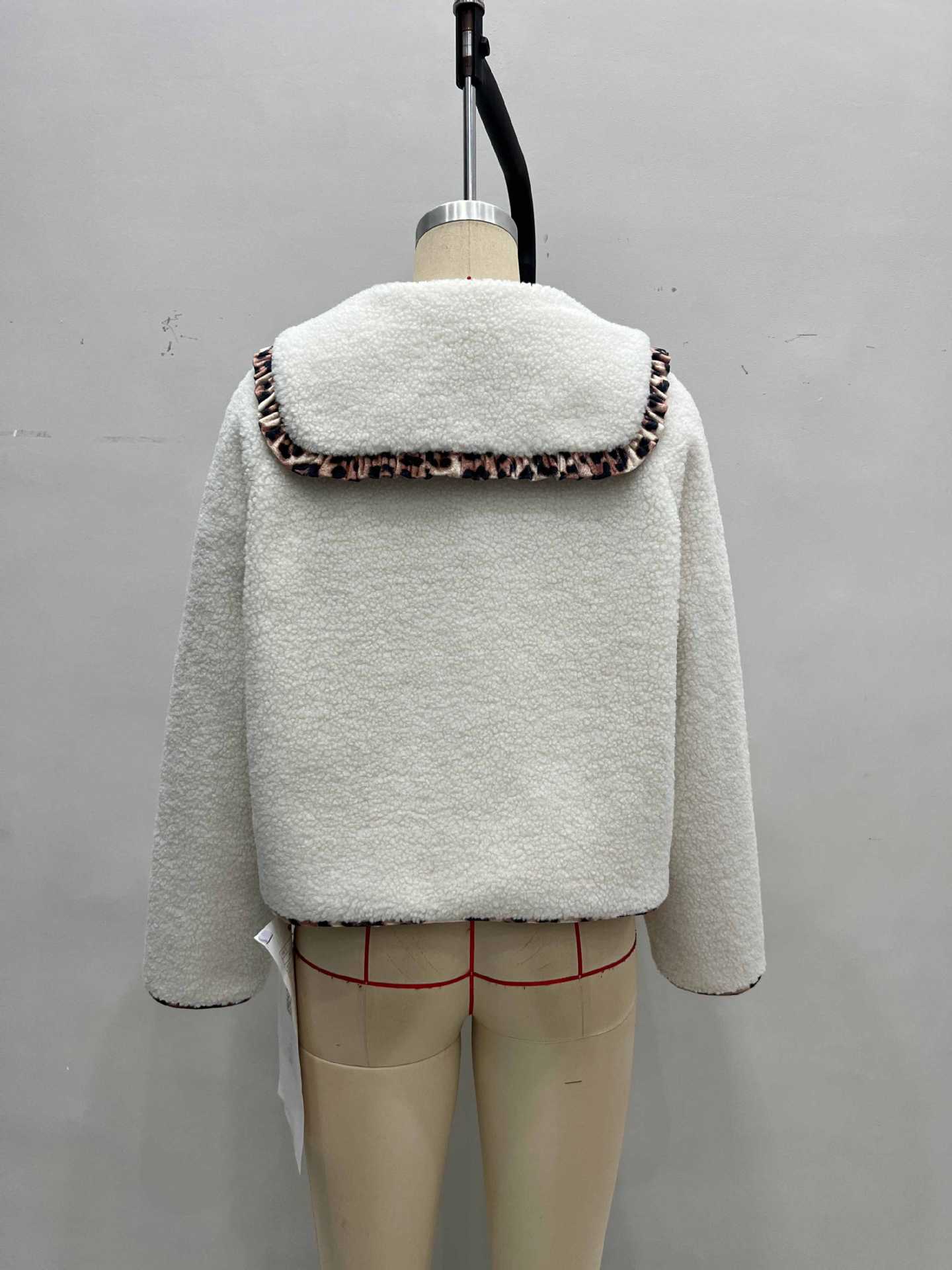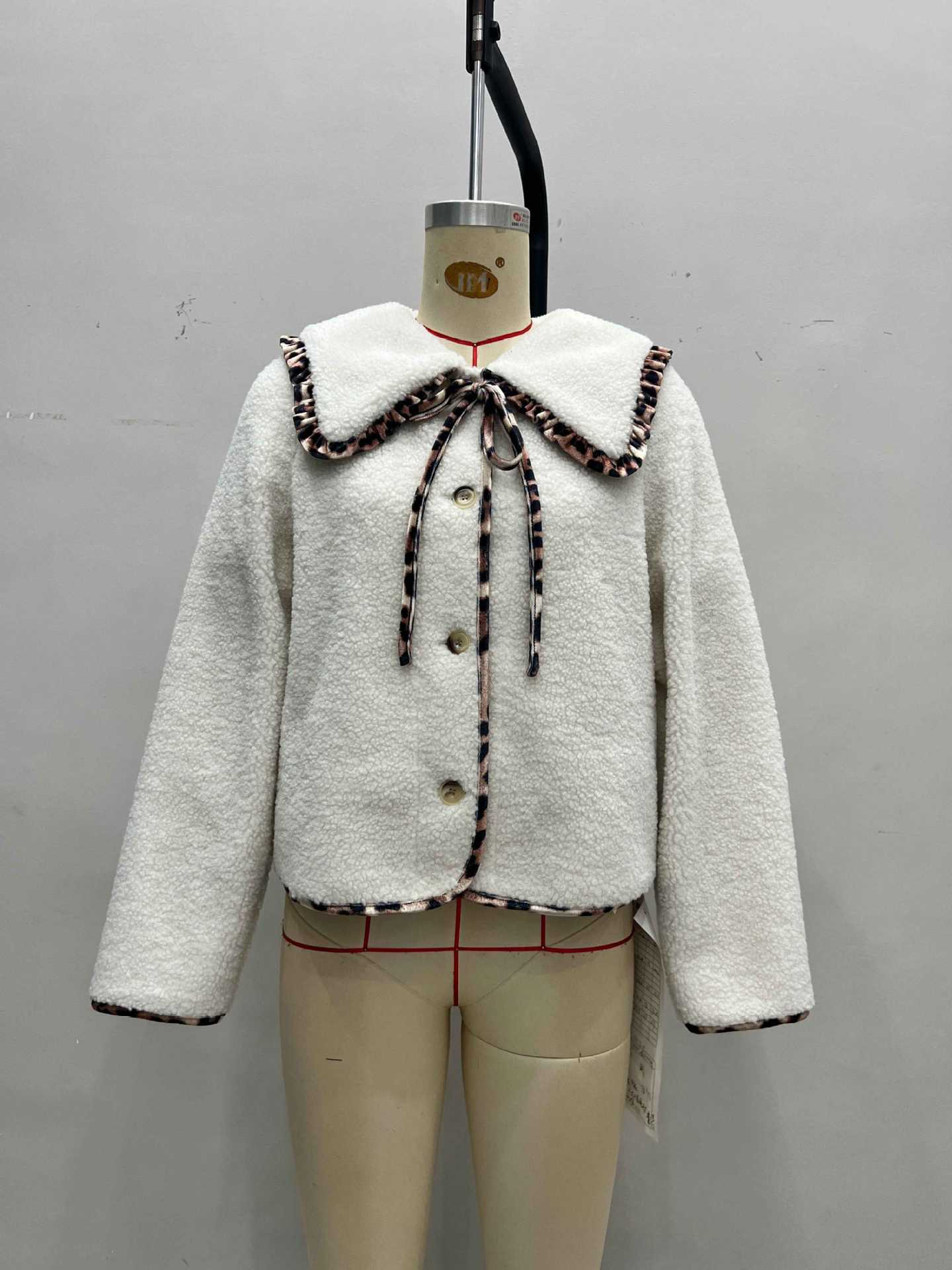 Autumn Winter Leopard Splicing Doll Collar Lace up Single Row Multi Buckle Design Lamb Plush Coat Women