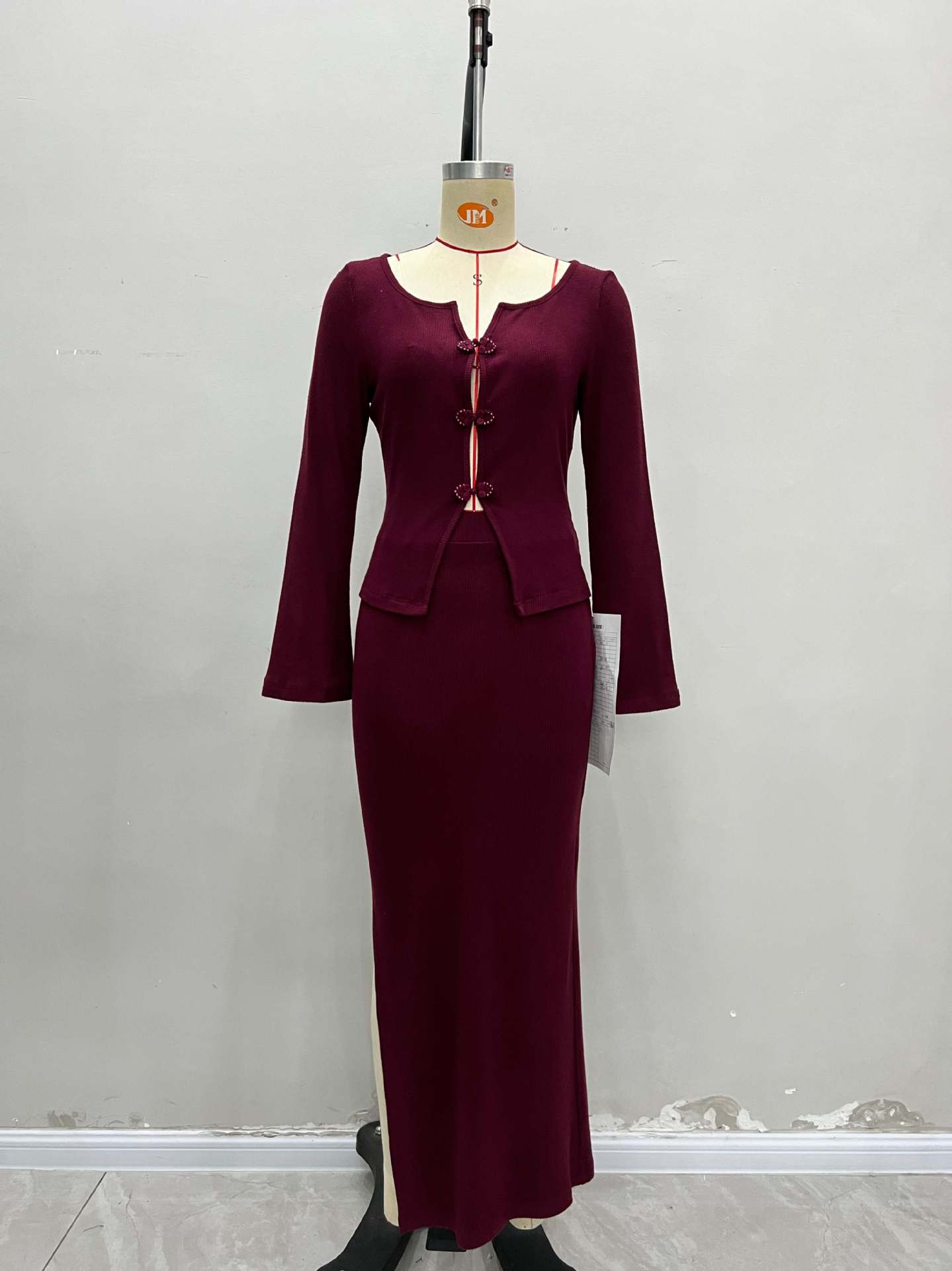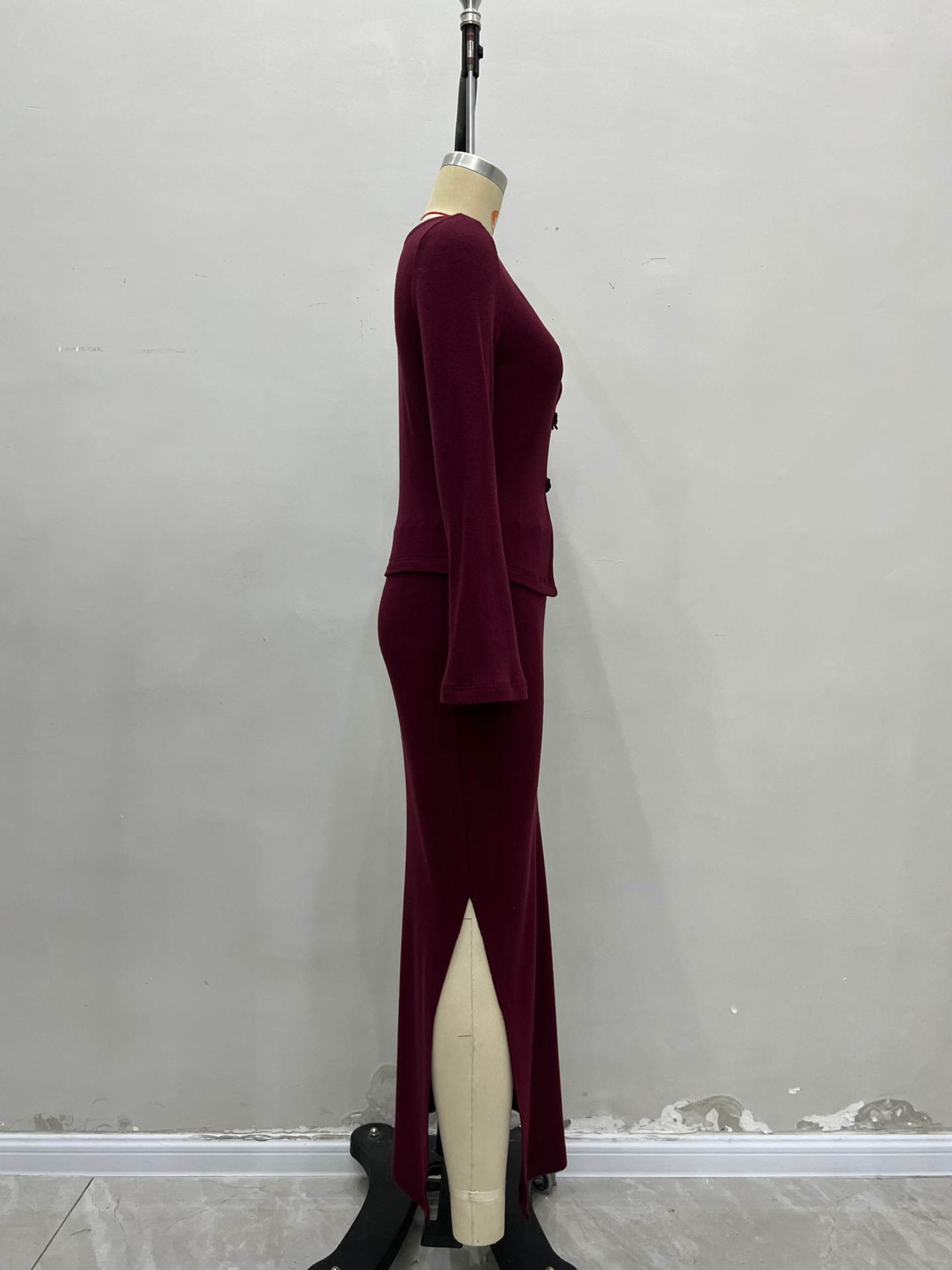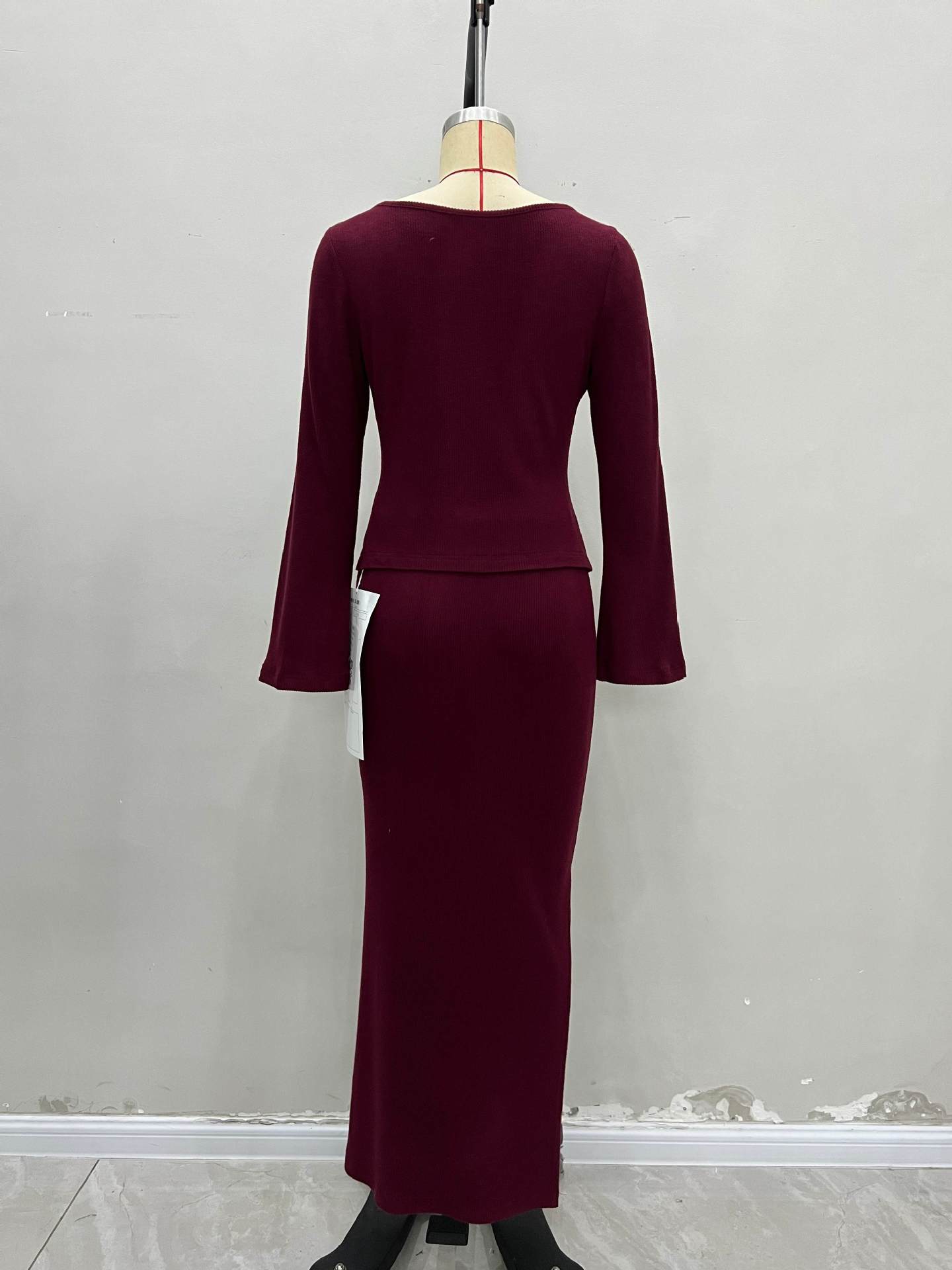 Burgundy Knitted Two Piece Square Collar Short Shirt Buckle Detail Design with Slim Hip Skirt Set