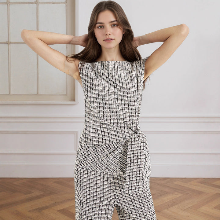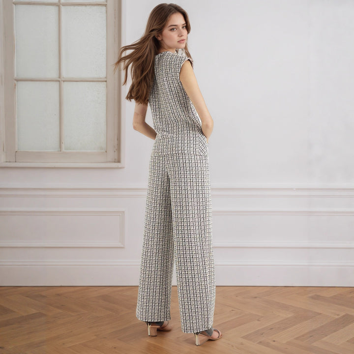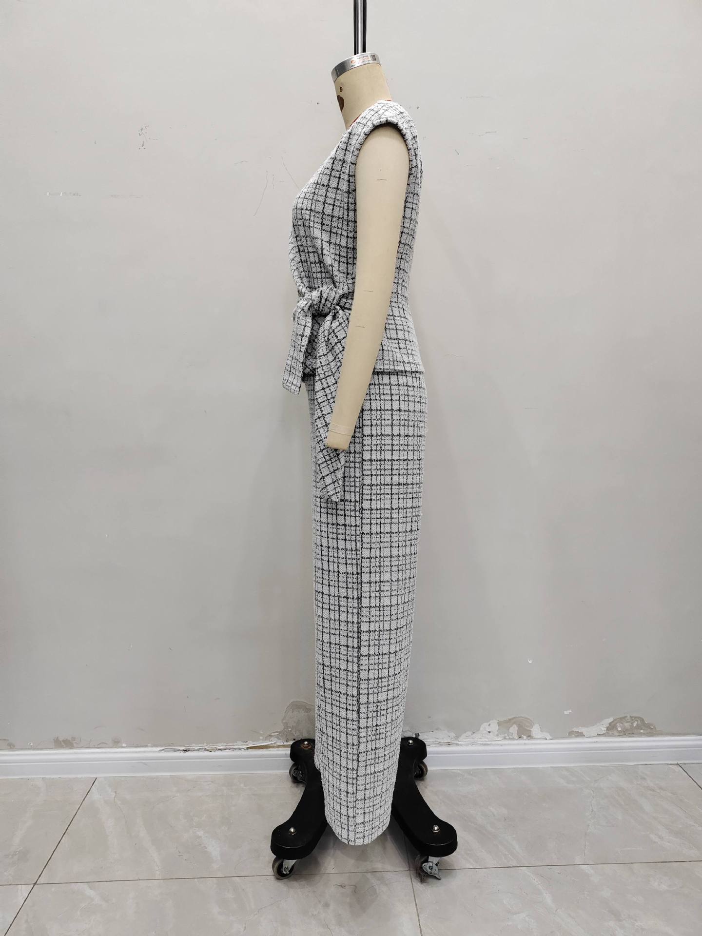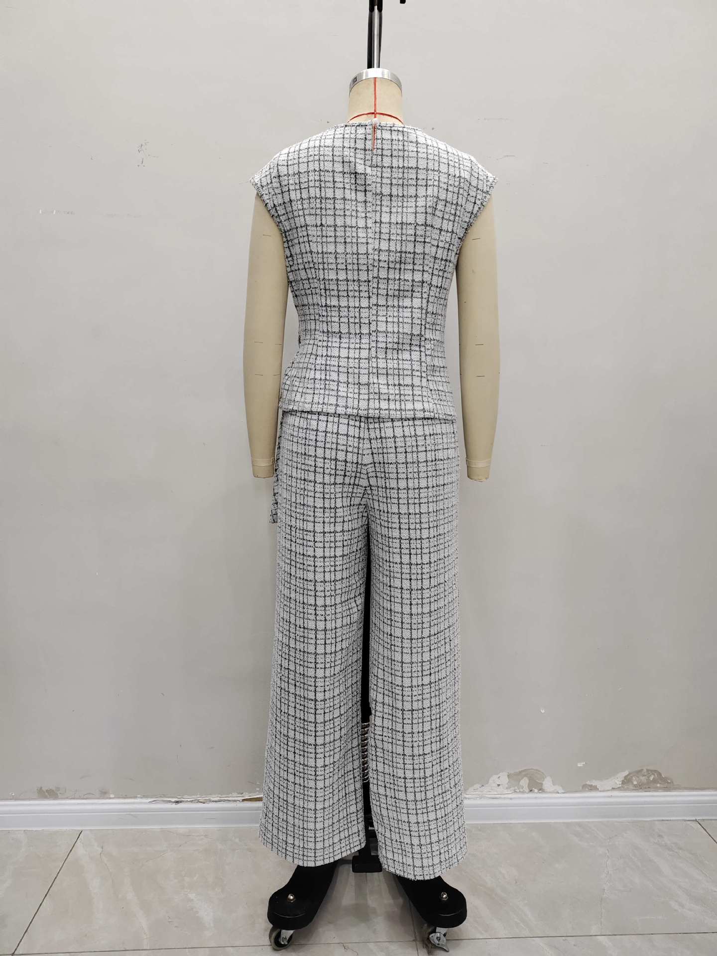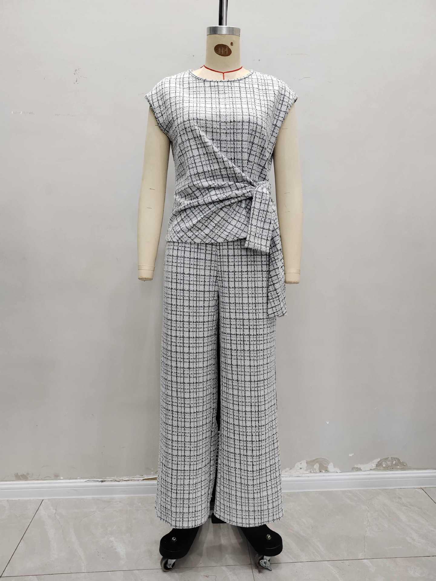 Fall Sleeveless Lace up Waist Knot Slimming Plaid High Waist Wide Leg Pants Two Piece Set