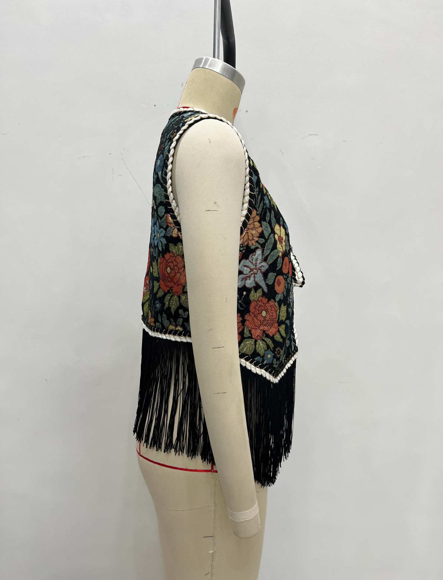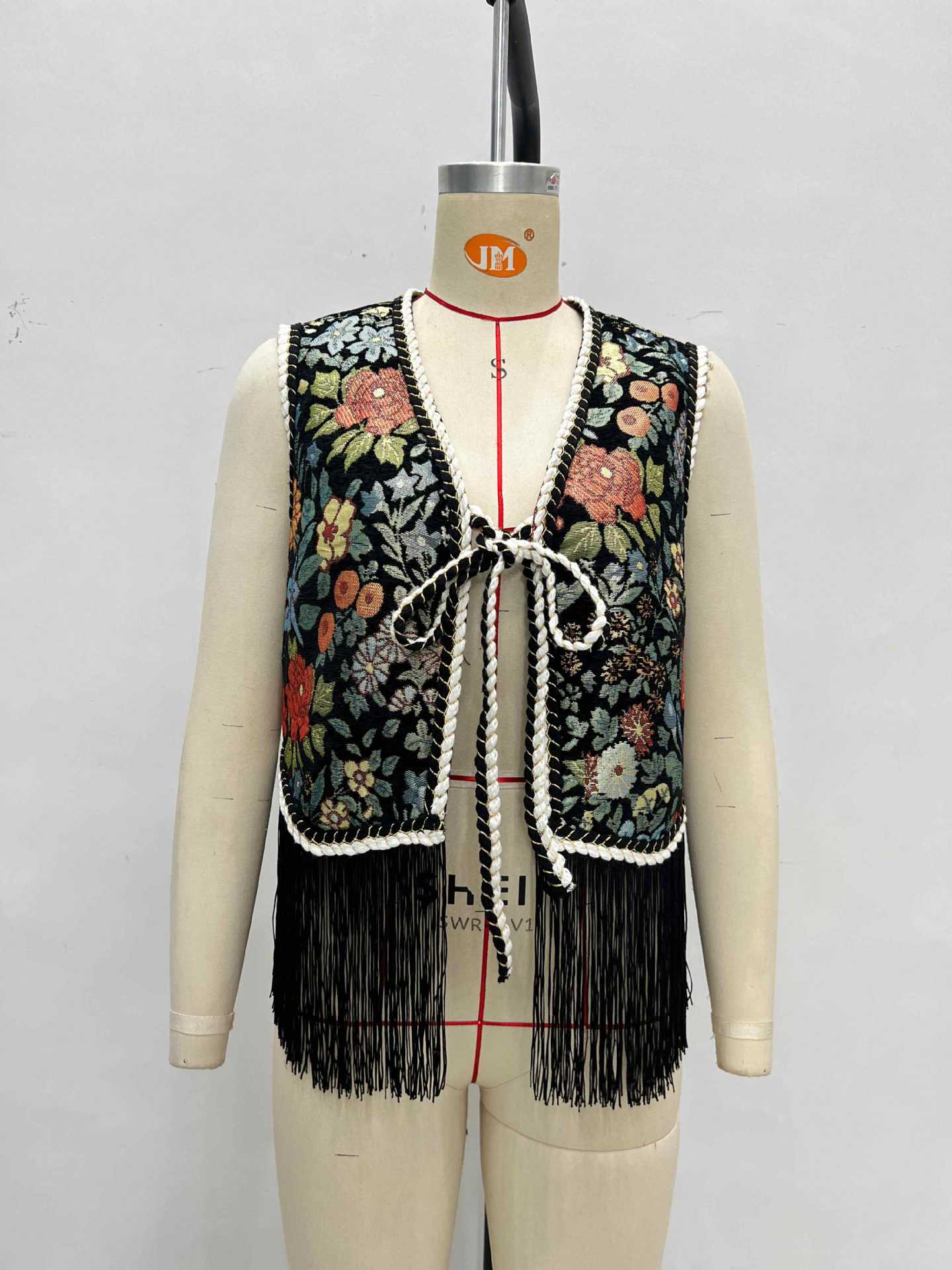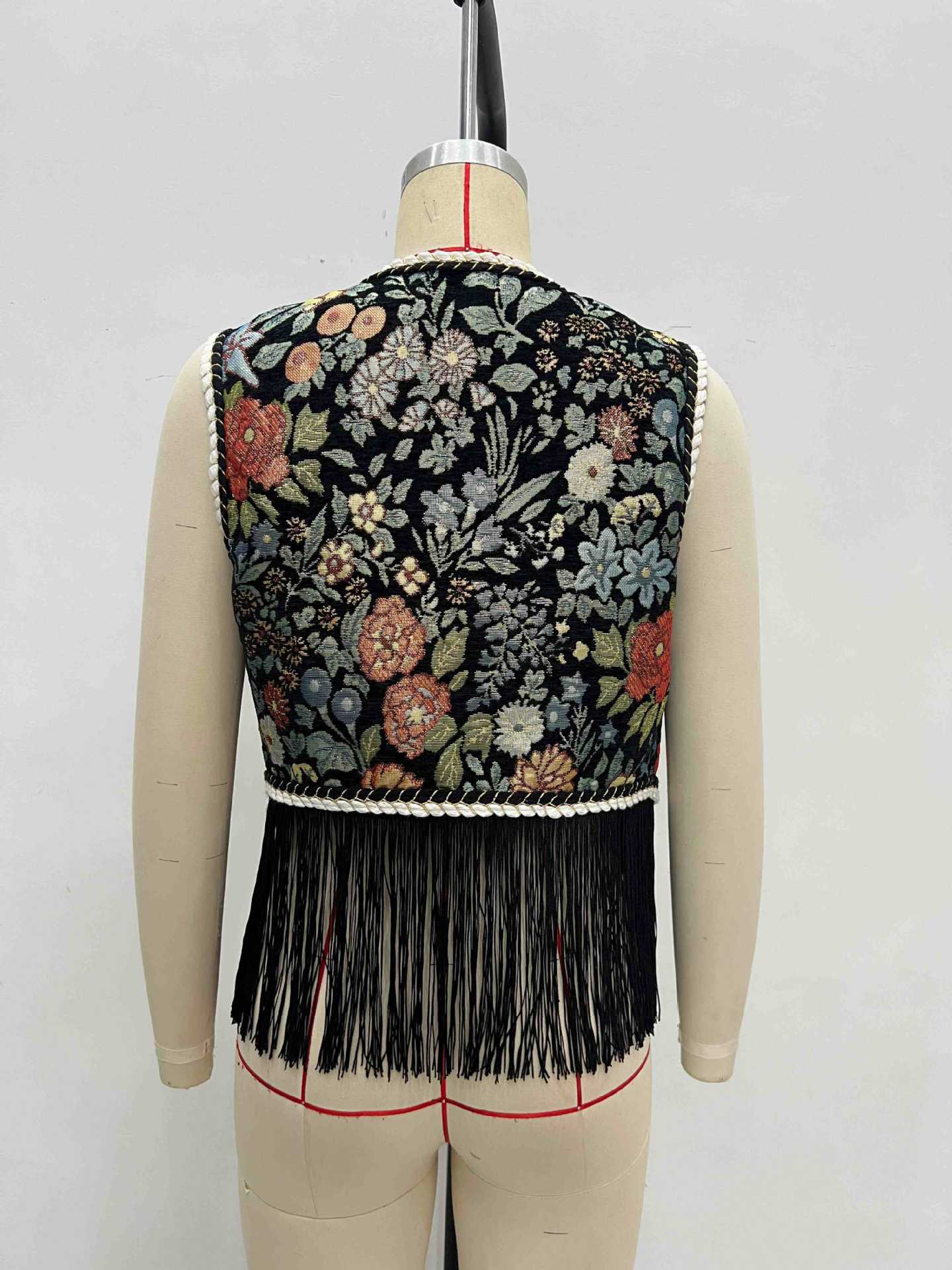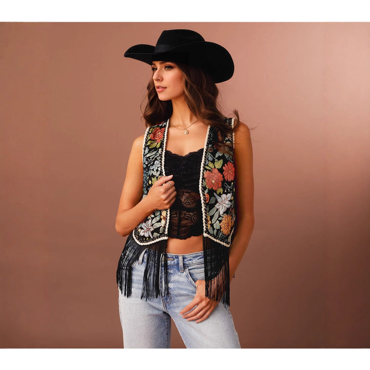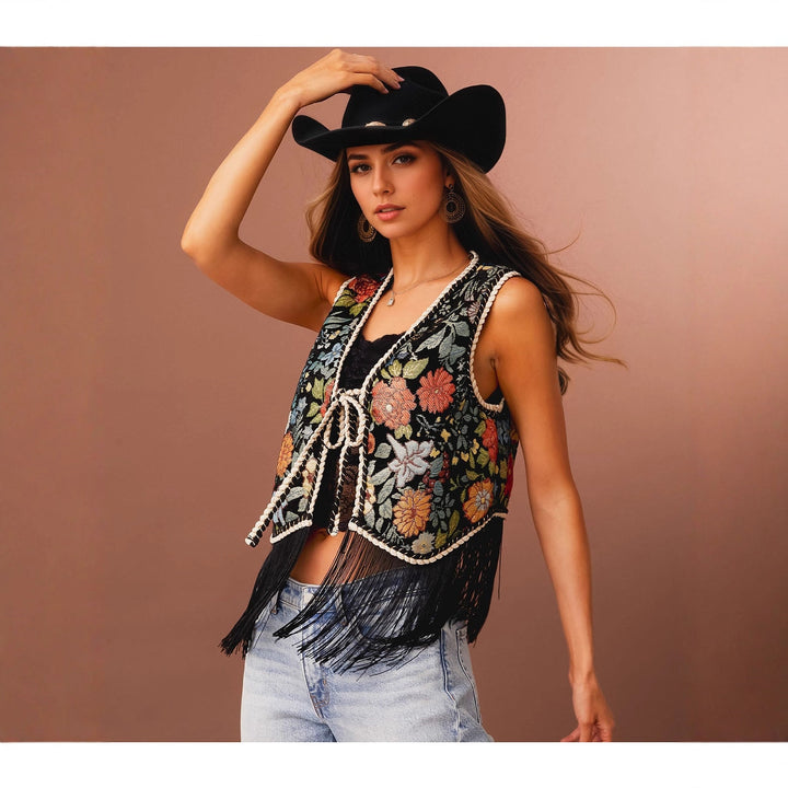 Floral Embroidery with Woven Bandage Lace up Design Fringed Hem Sleeveless Vest