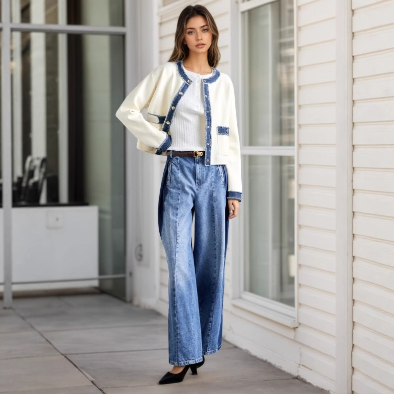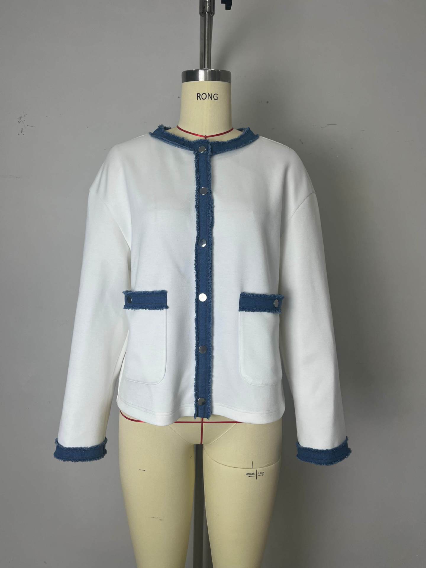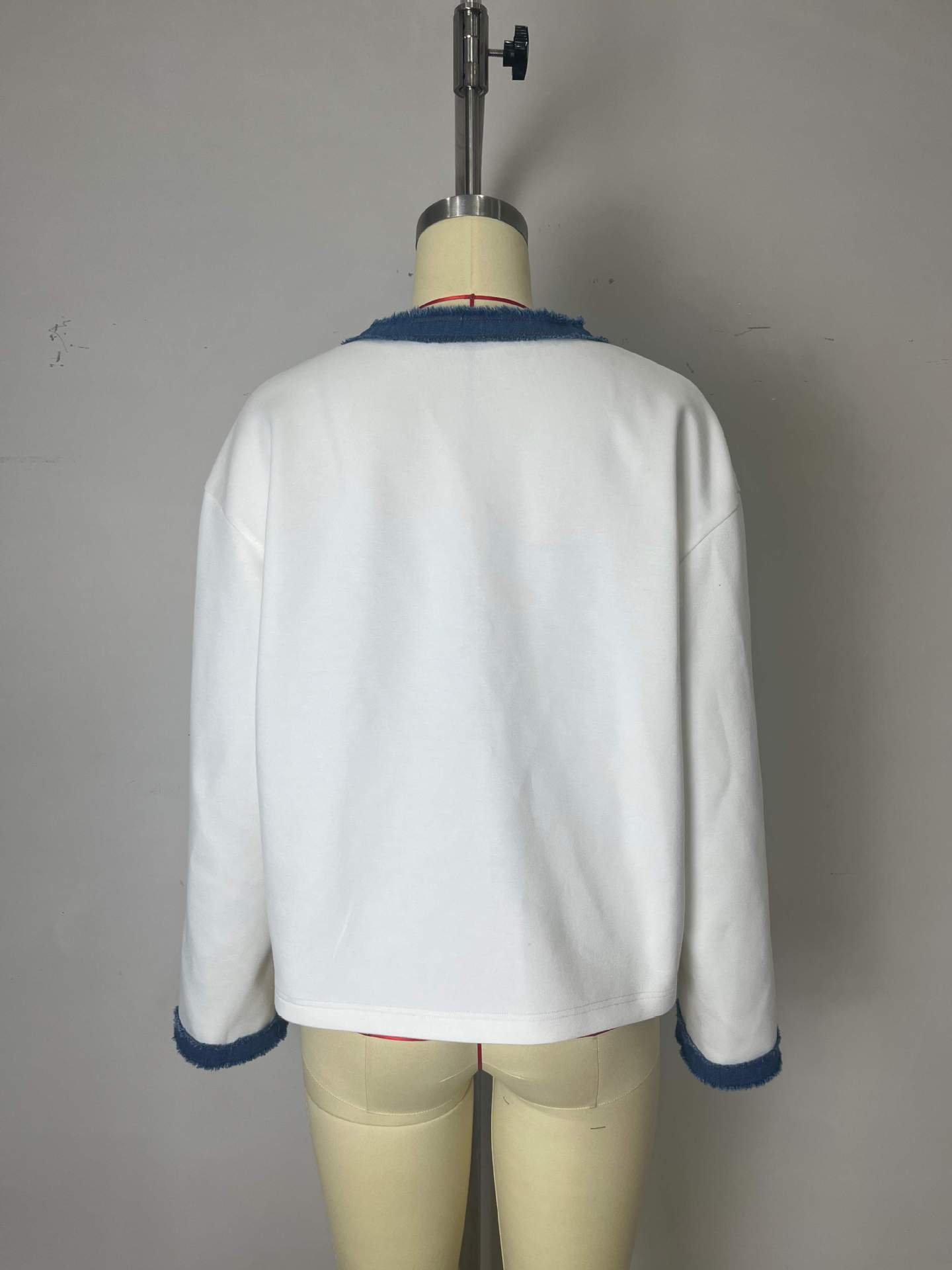 French Elegant Autumn Furry Denim Color Contrasting Stripe O neck Short Coat