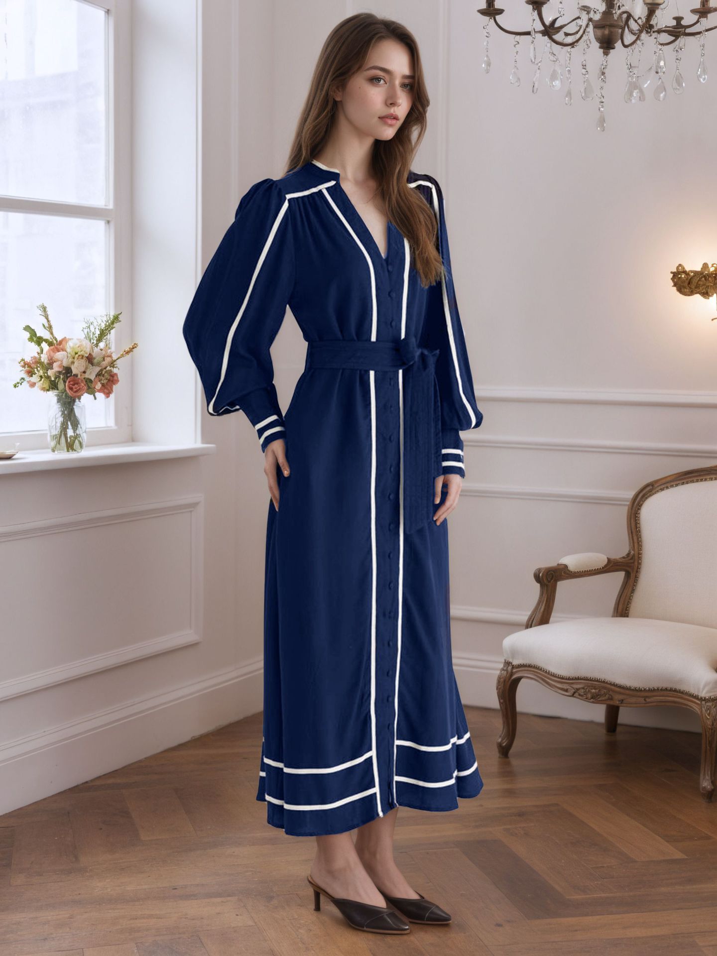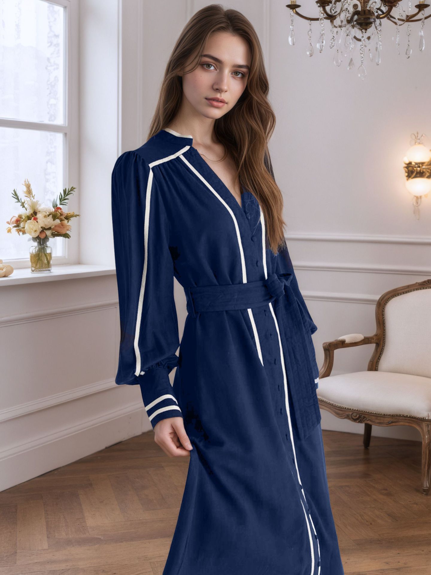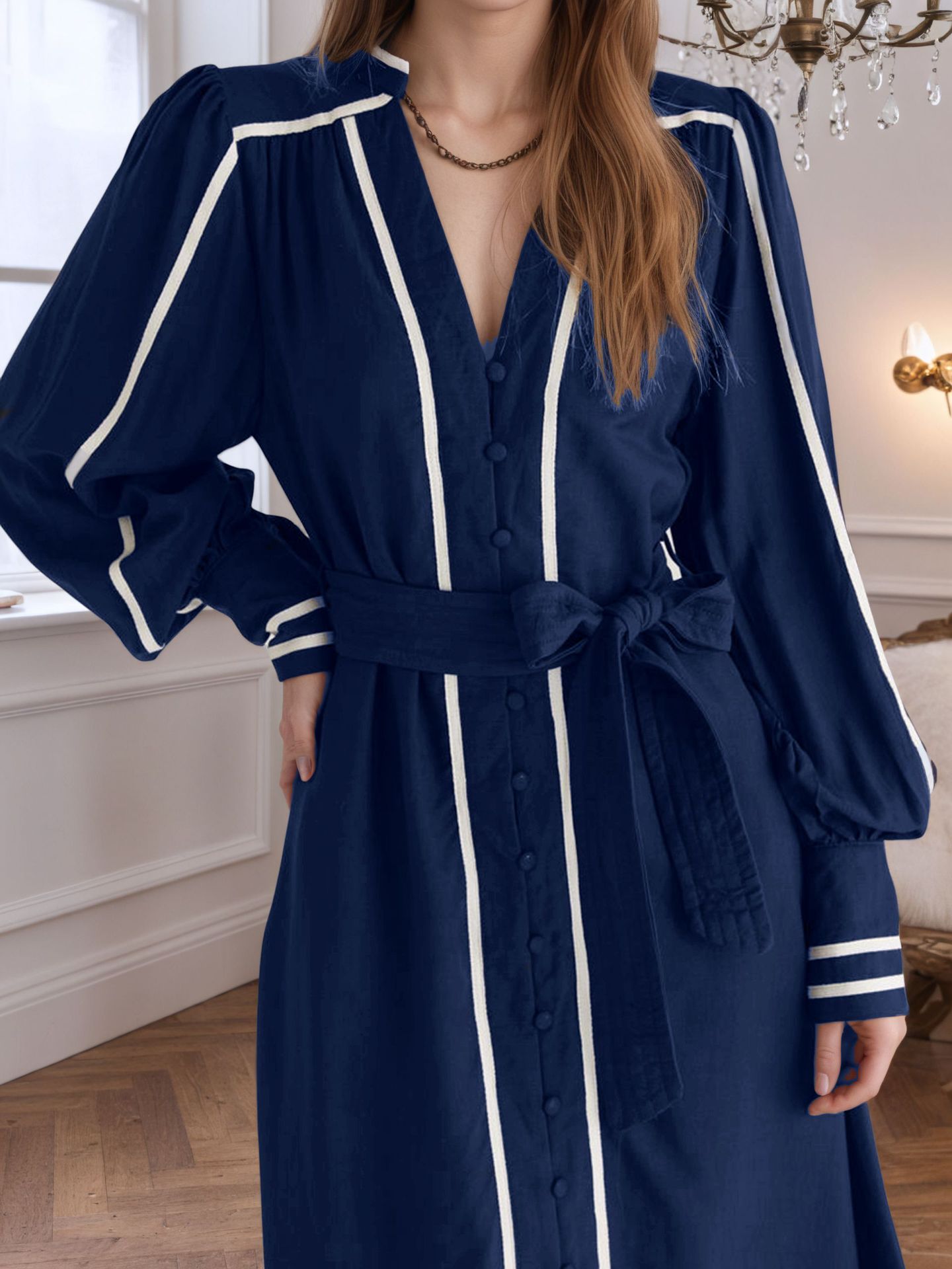 Retro V neck Light Self Tie Dress White Striped Design Retro to Create Dream