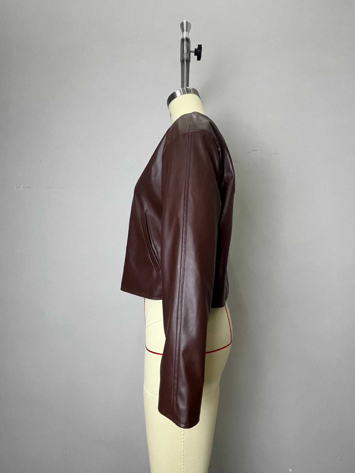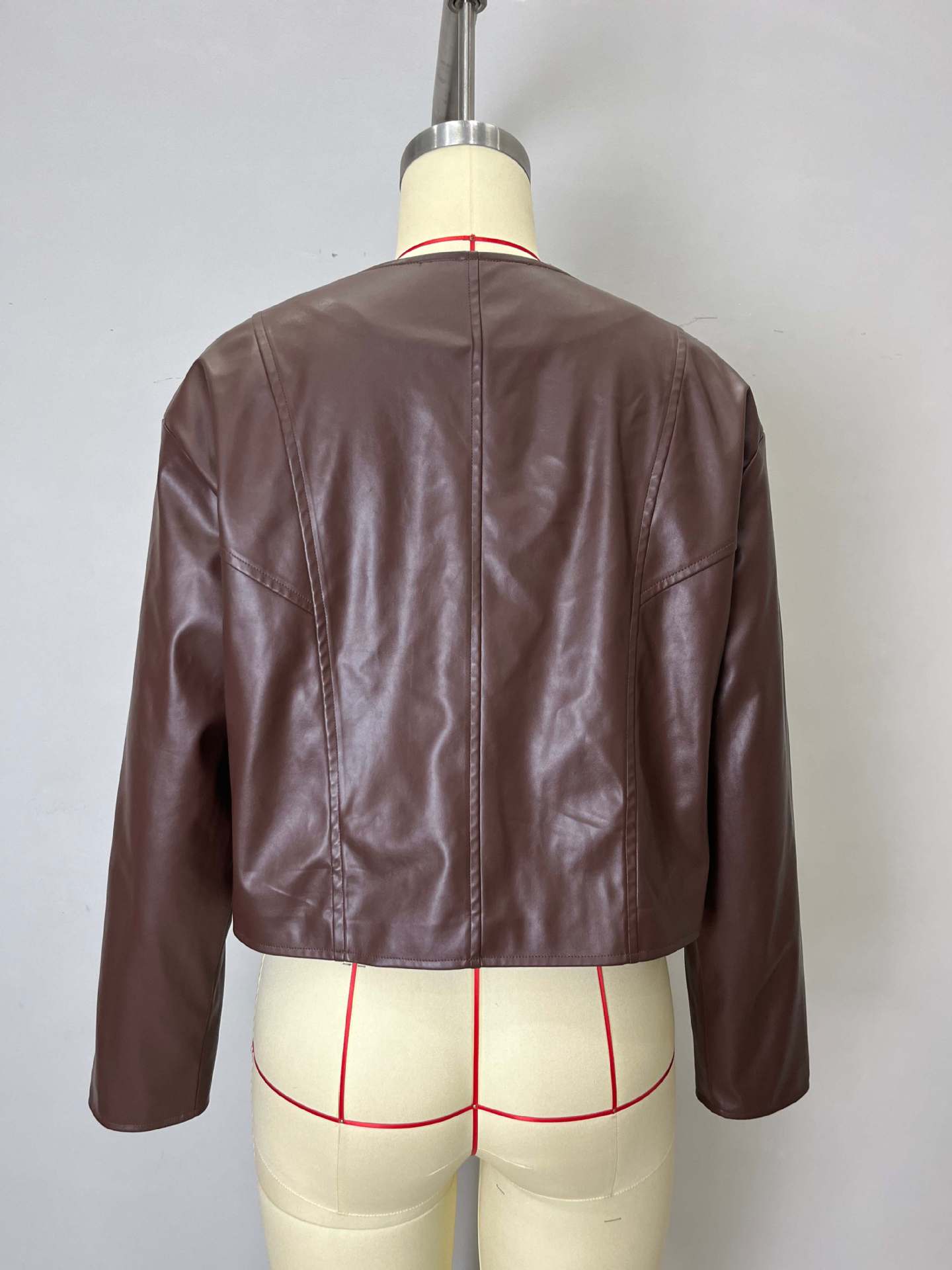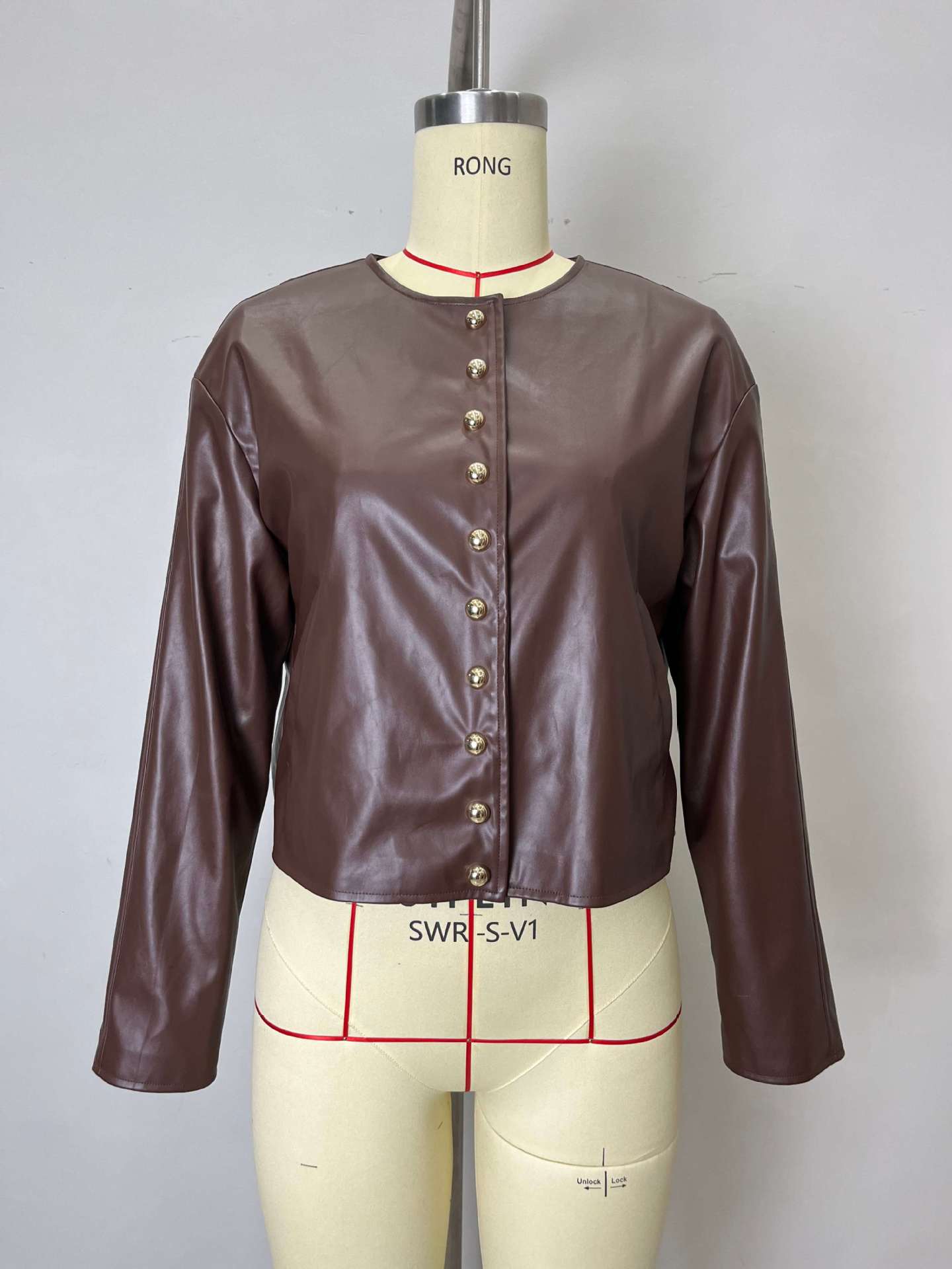 Short Leather Coat Dark Brown Texture Exquisite Golden Button Arrangement Decorative Coat