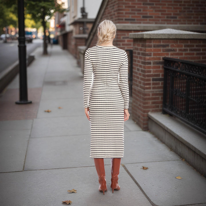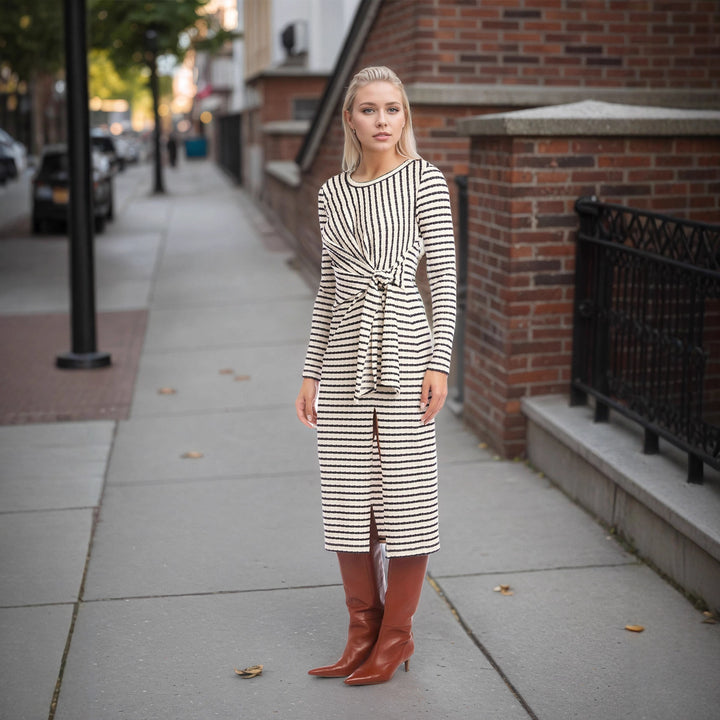 Striped Waist Twist Waist Controlled Slim Fit Slimming Split round Neck Dress