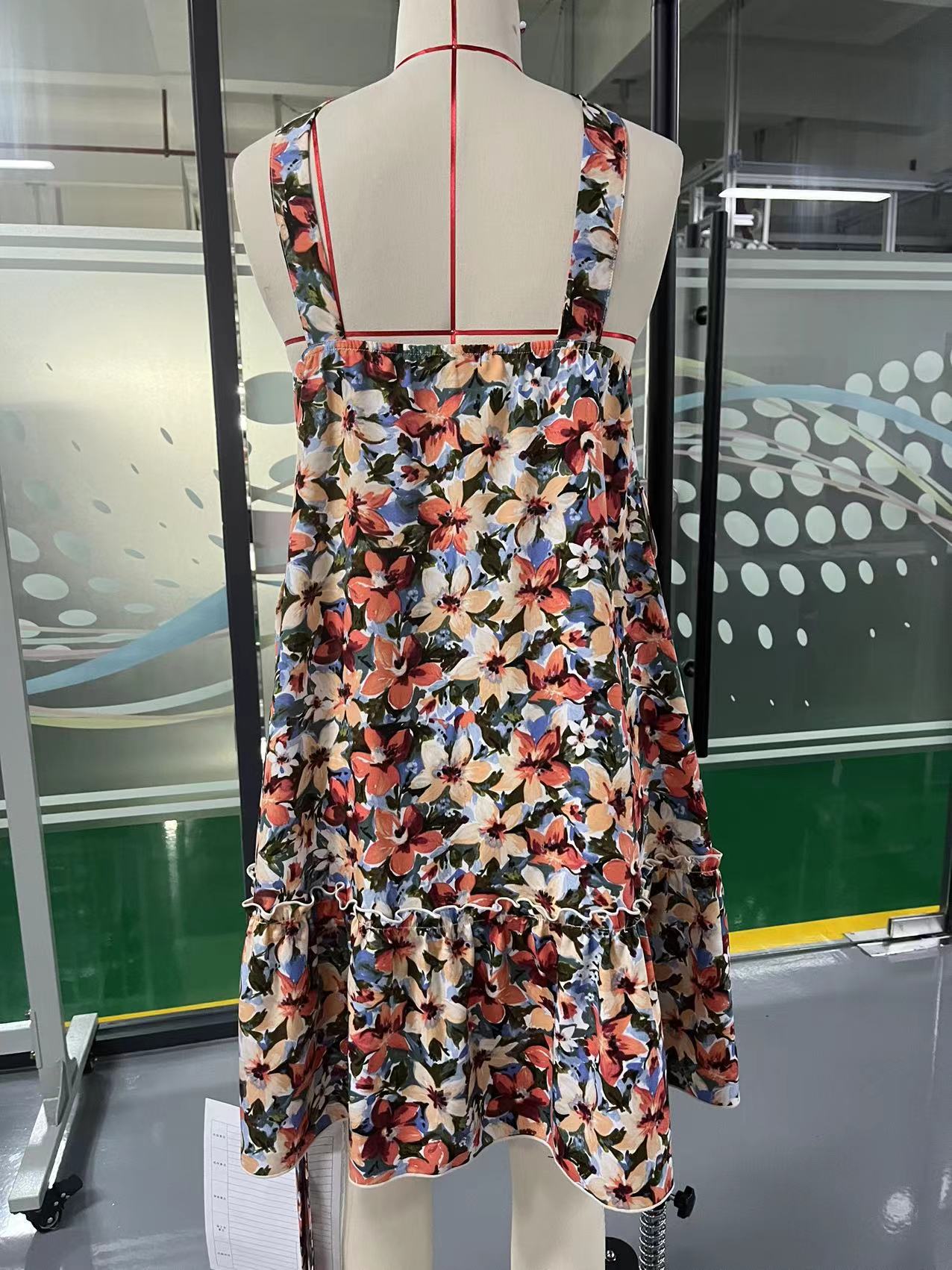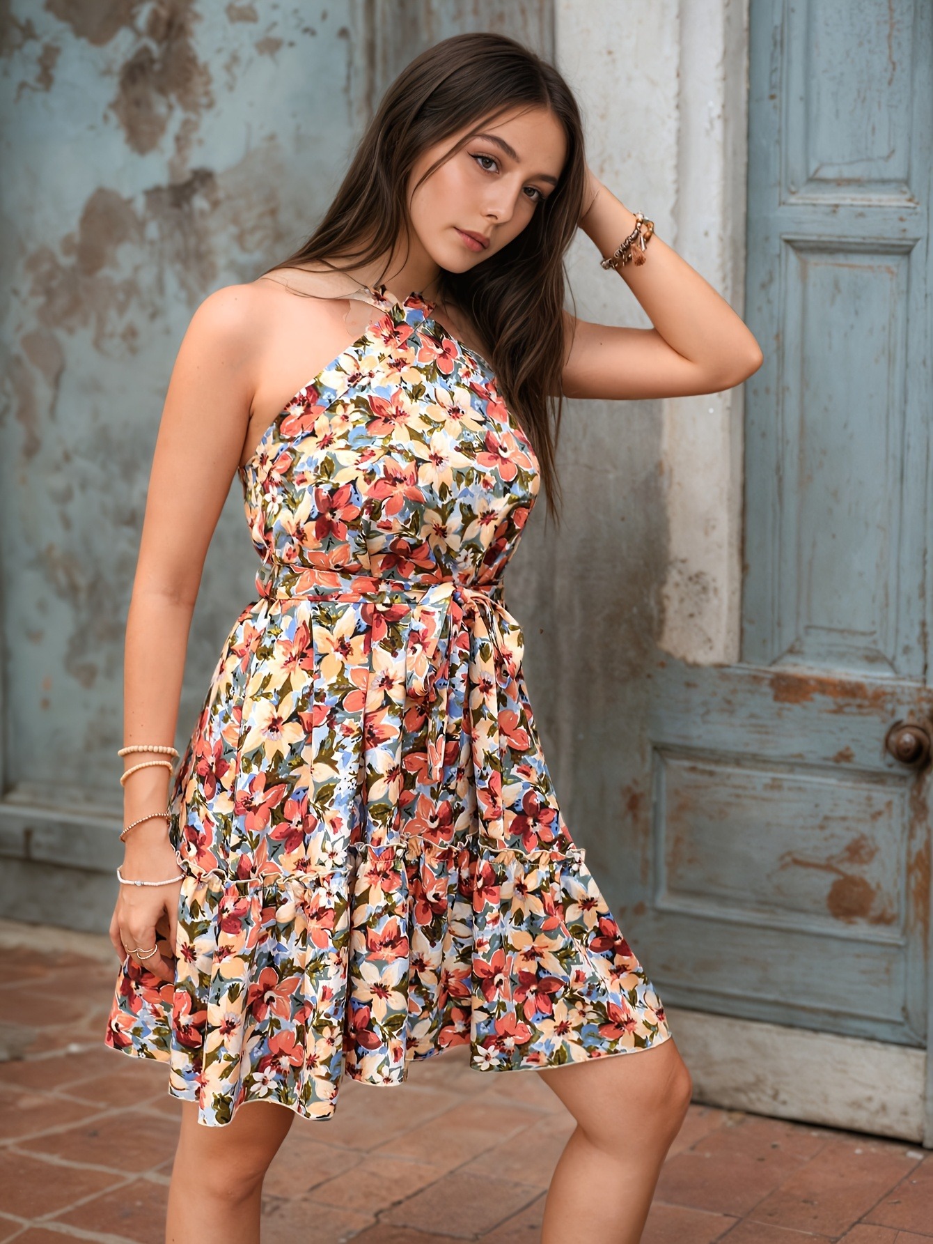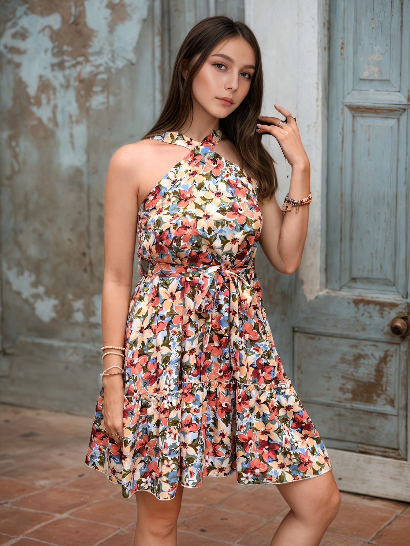 Women Clothing Halter Cross Shoulder Strap Dress Vacation Bohemian Floral Print Pleated Chest Wrapped Dress