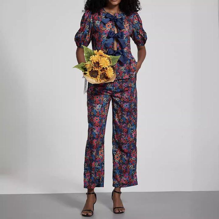 Women Clothing Pastoral Sets Bow Tie Shoulder Floral Puff Sleeve Top Trousers