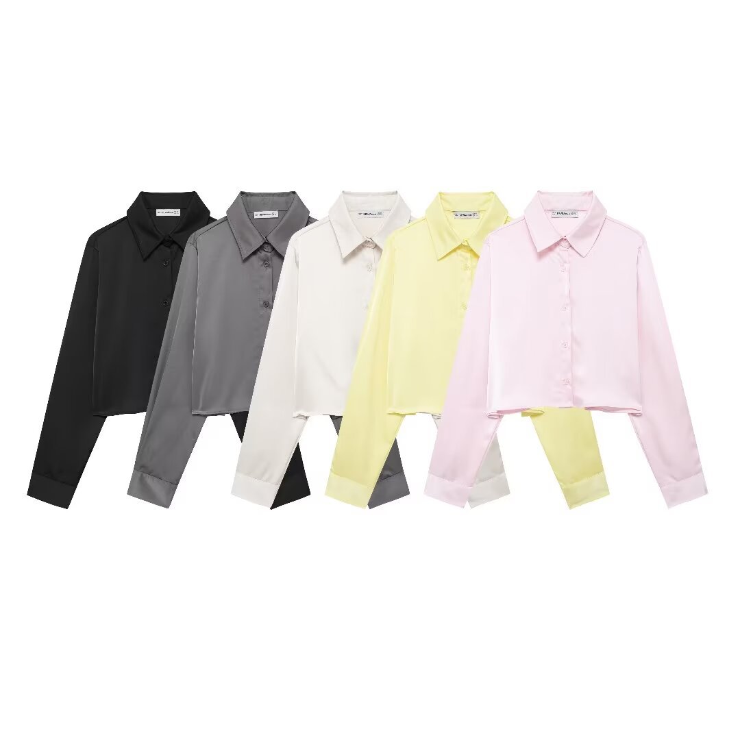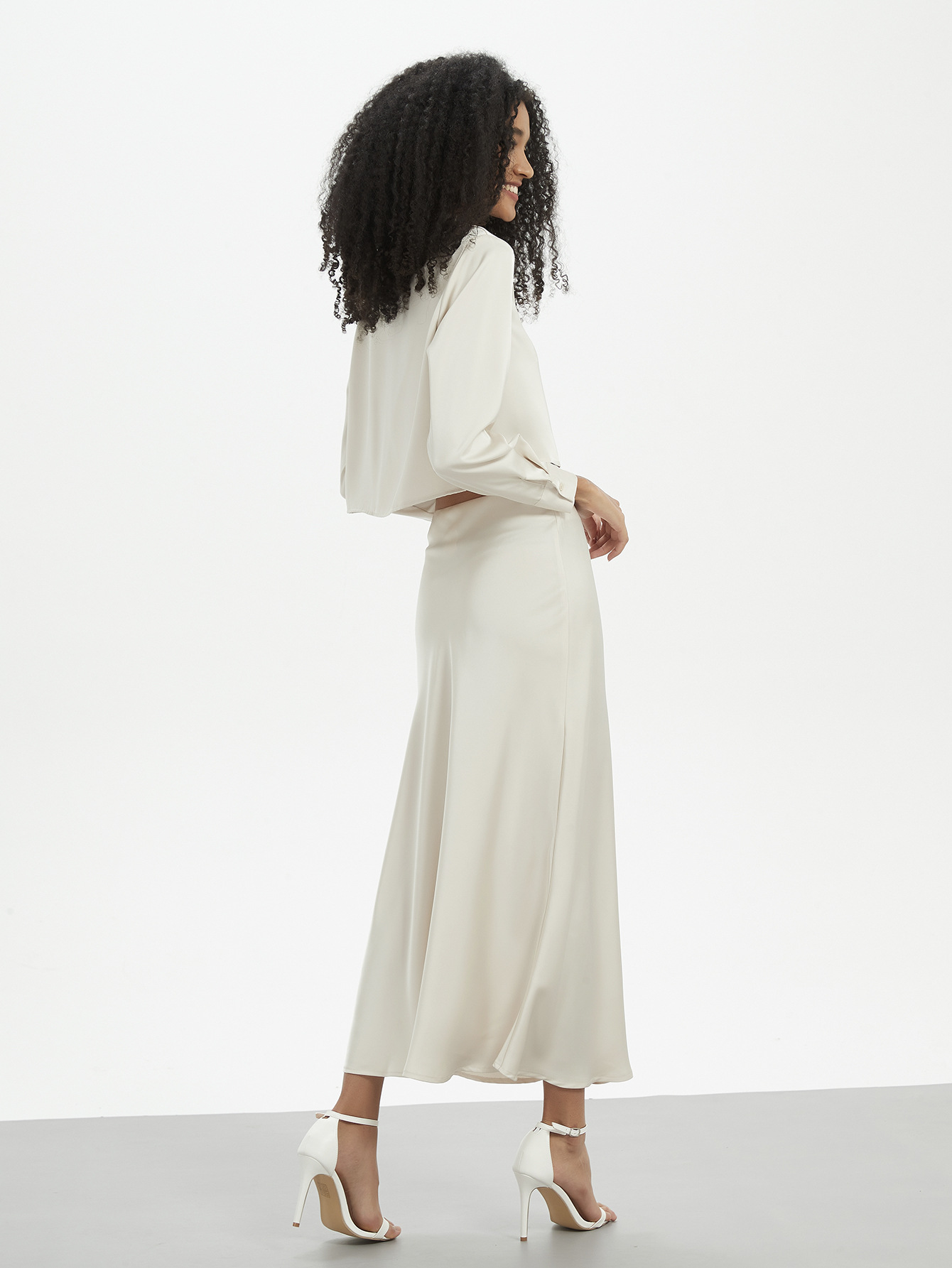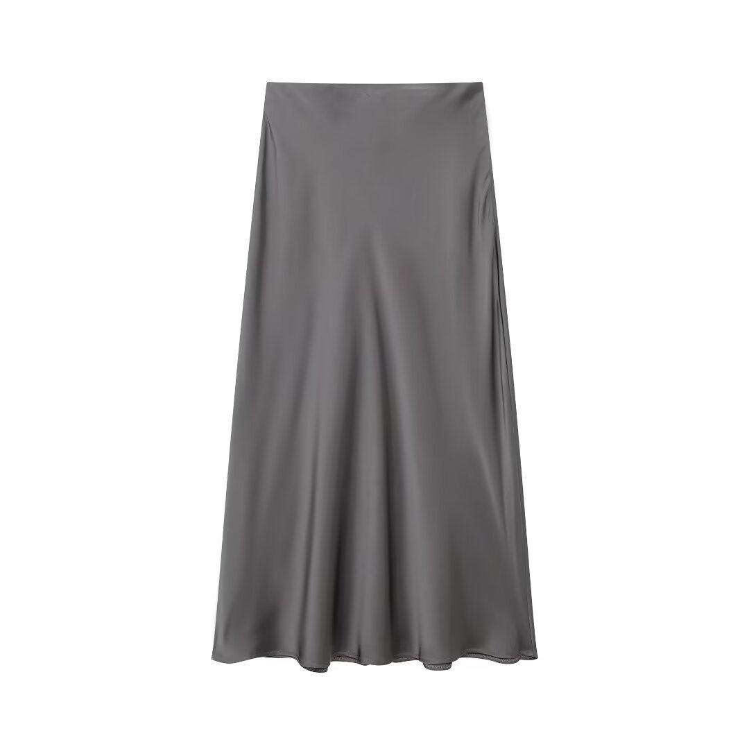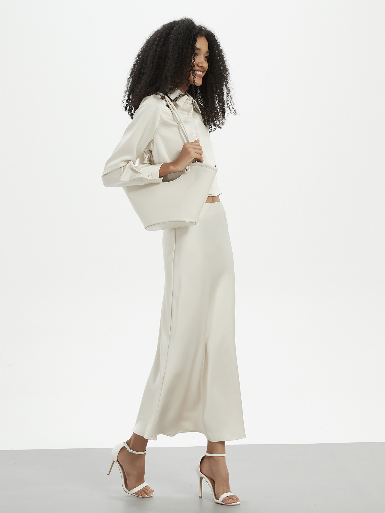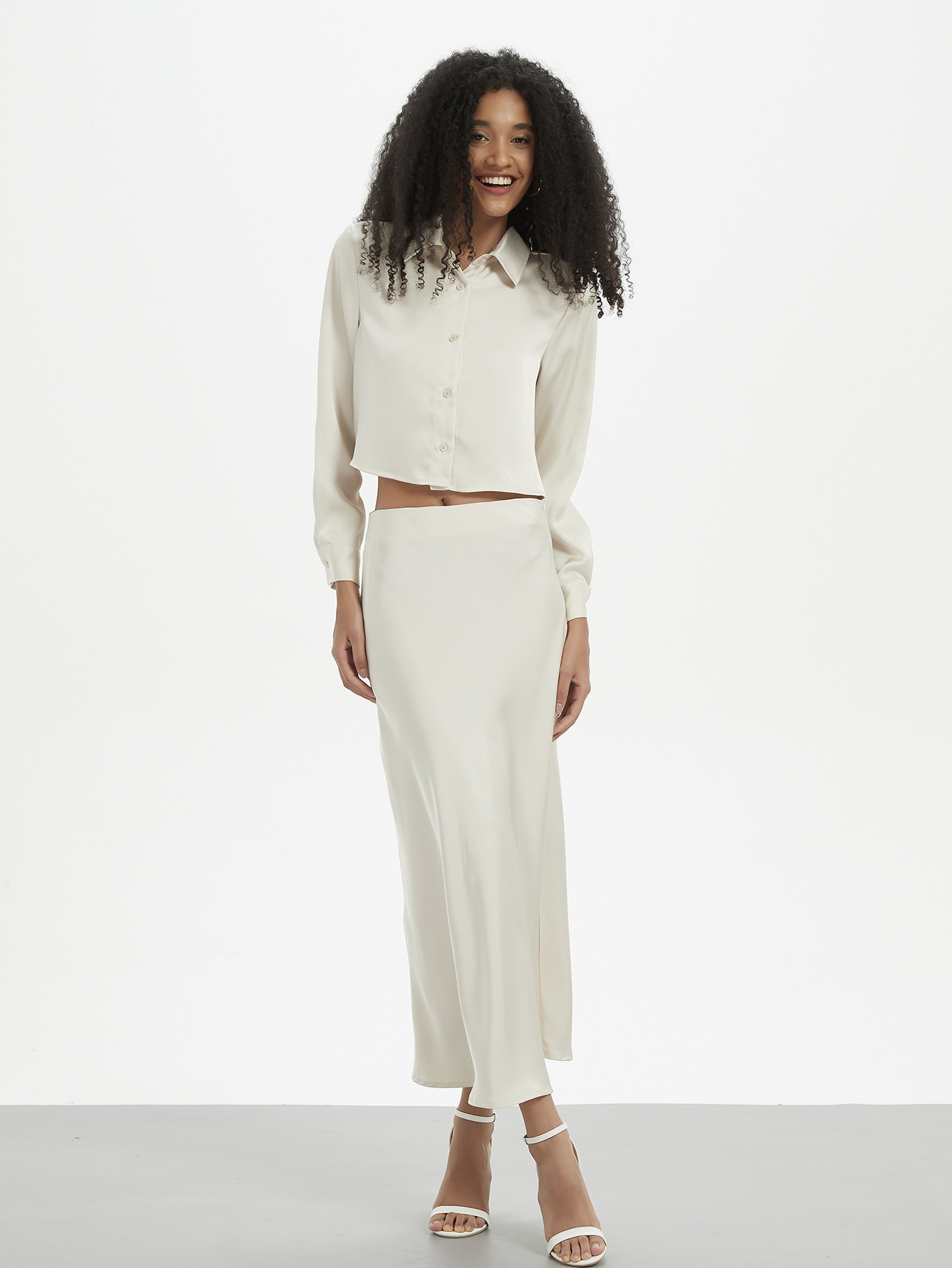 Women Clothing Simple Two Piece Sets Silk Satin Texture Long Sleeve Shirt Drape Skirt