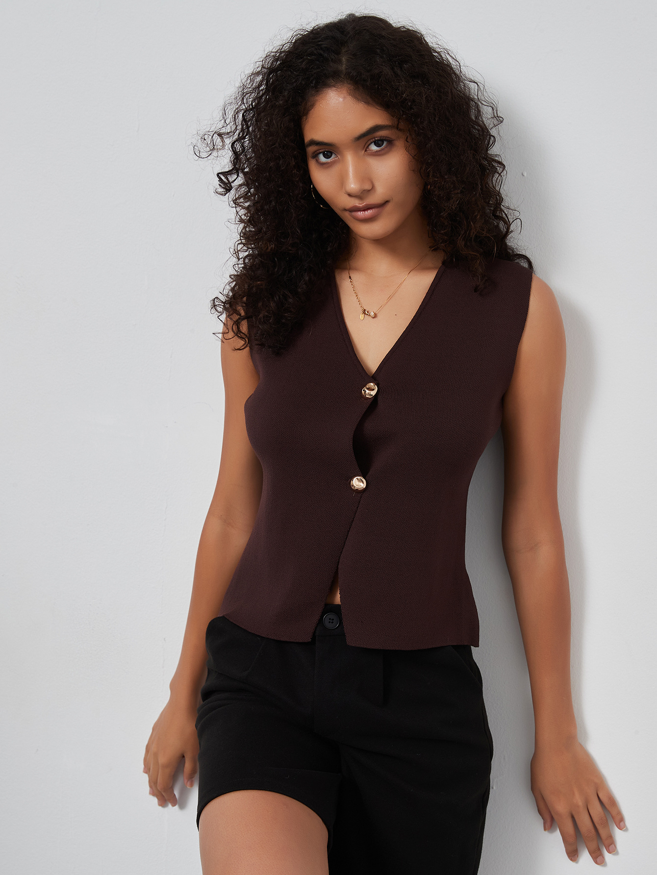 Women Clothing Slim Fit Slimming Slit Design V neck Two Button Knitted Vest Jacket Top