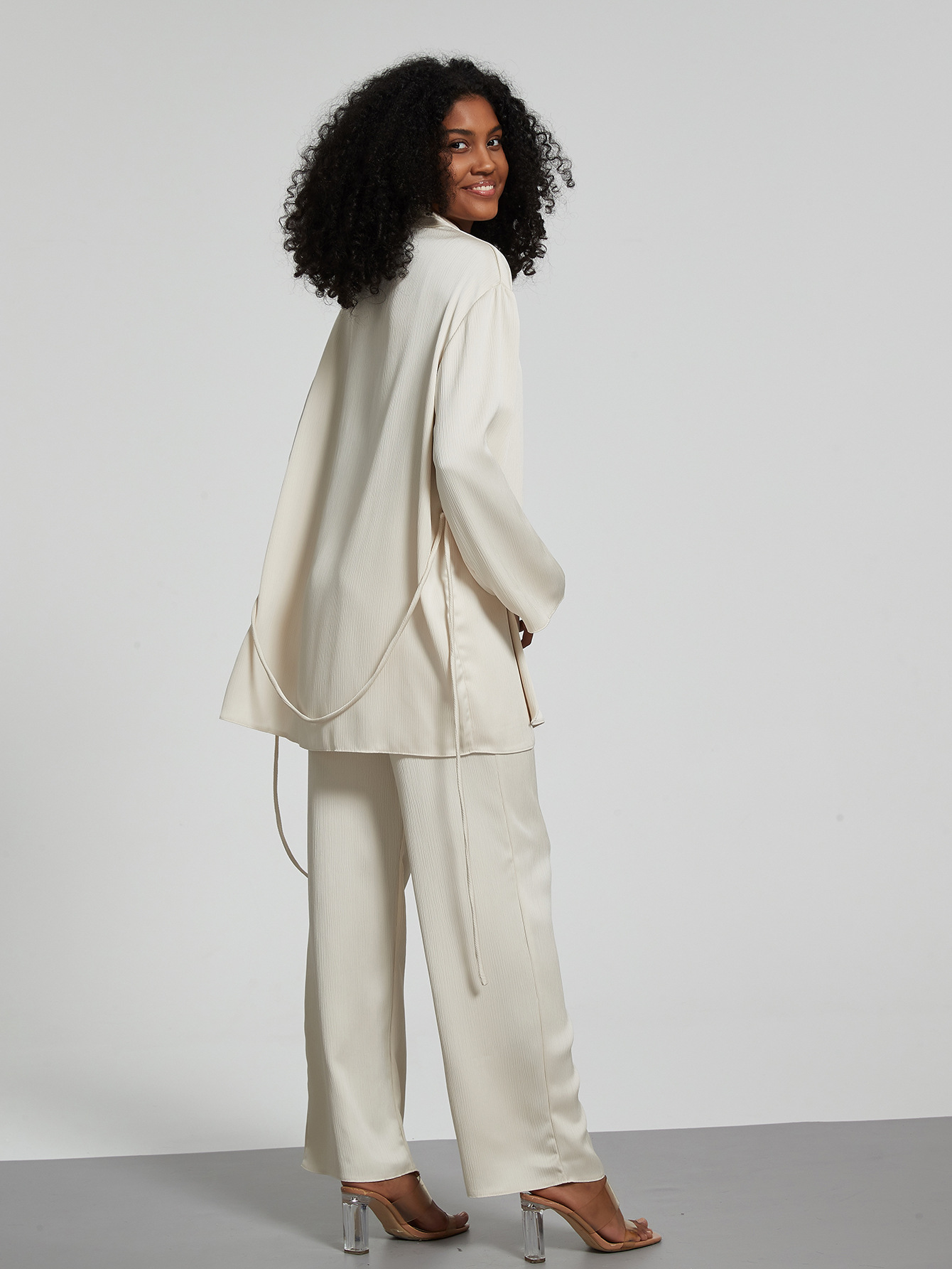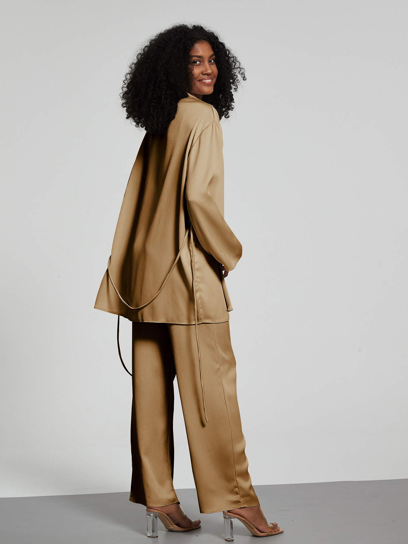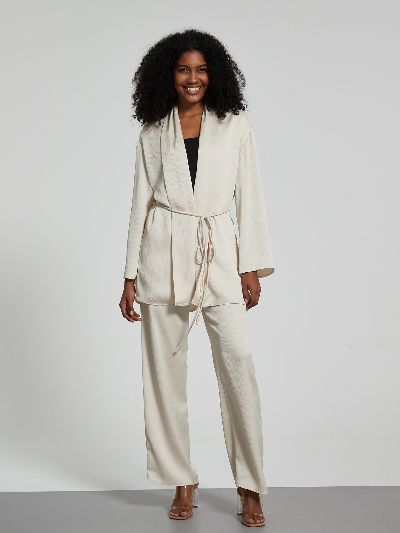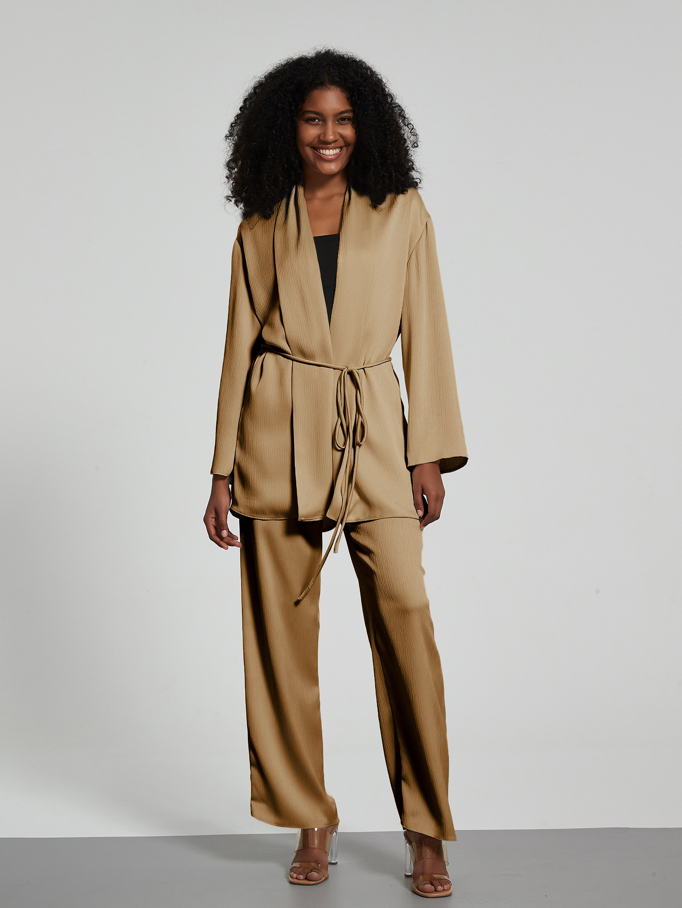 Women Clothing Two Piece Sets Collared Tied Tight Waist Pleated Coat Top Loose Trousers Autumn