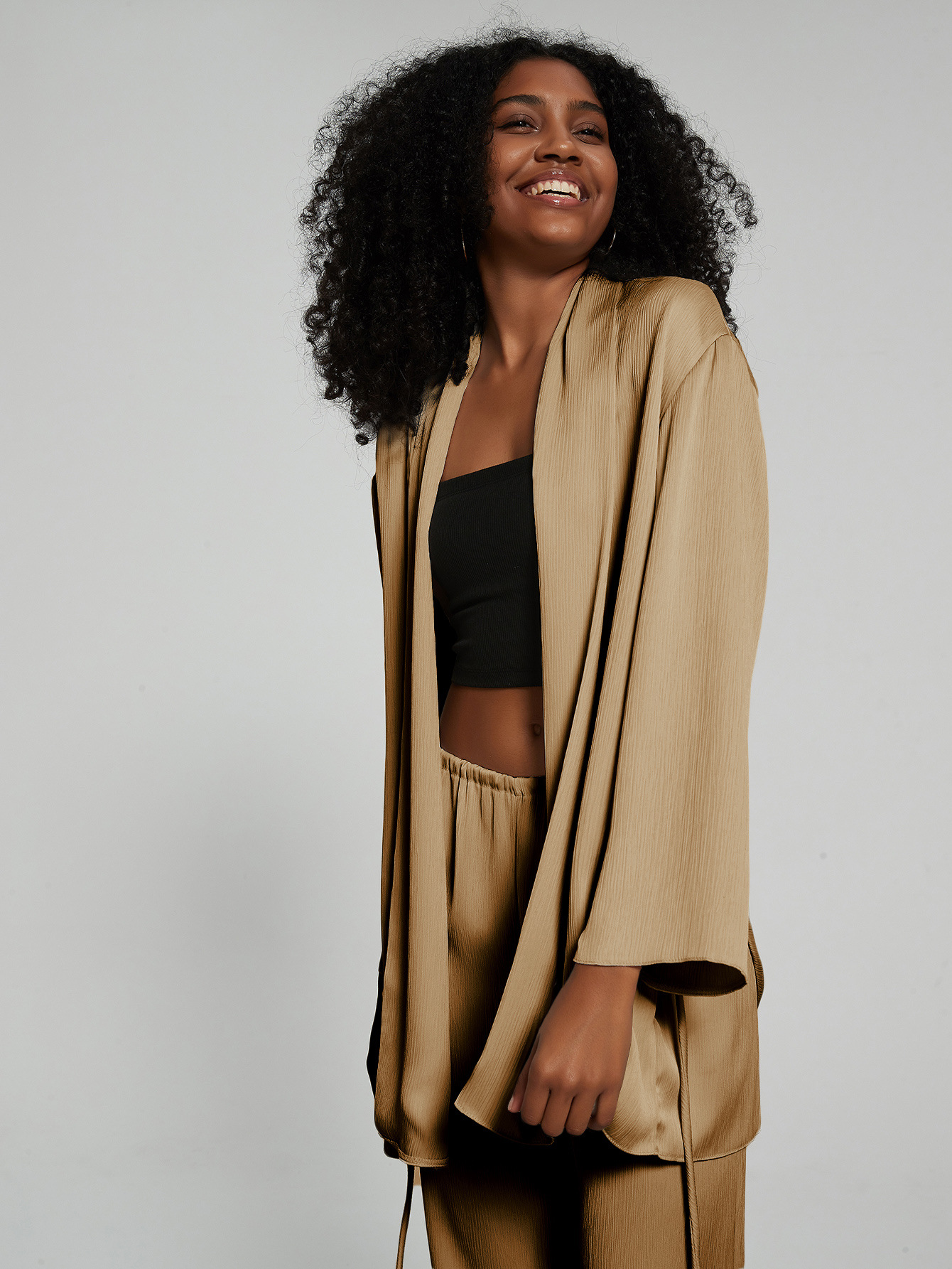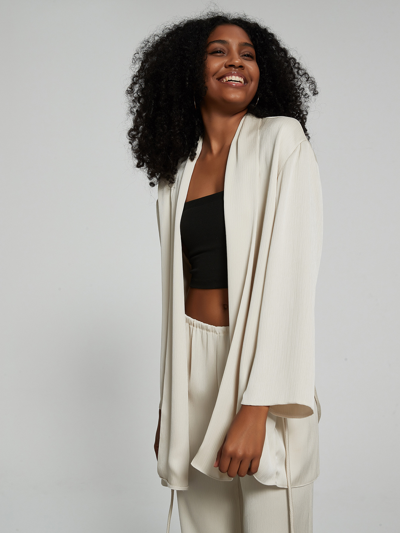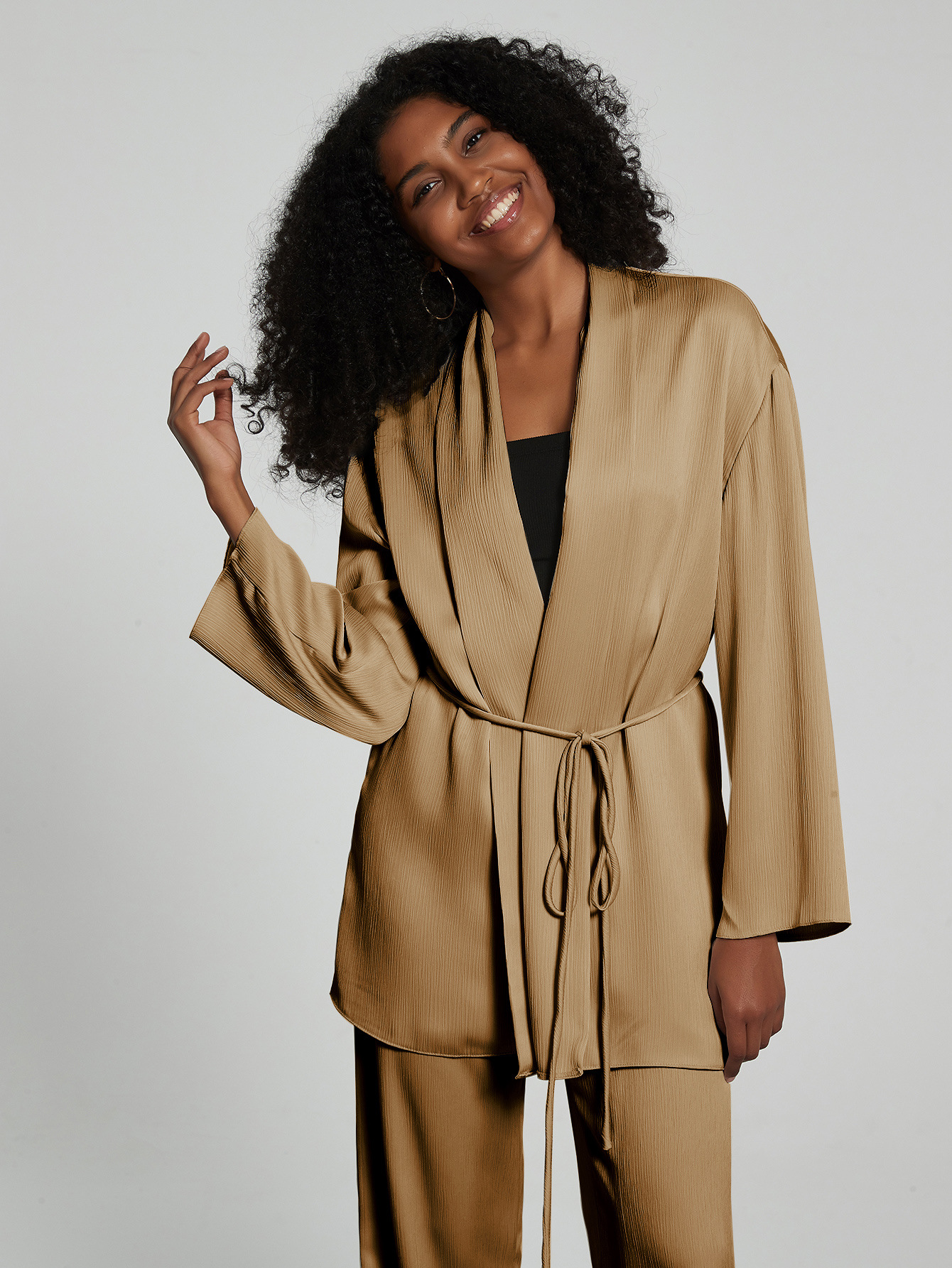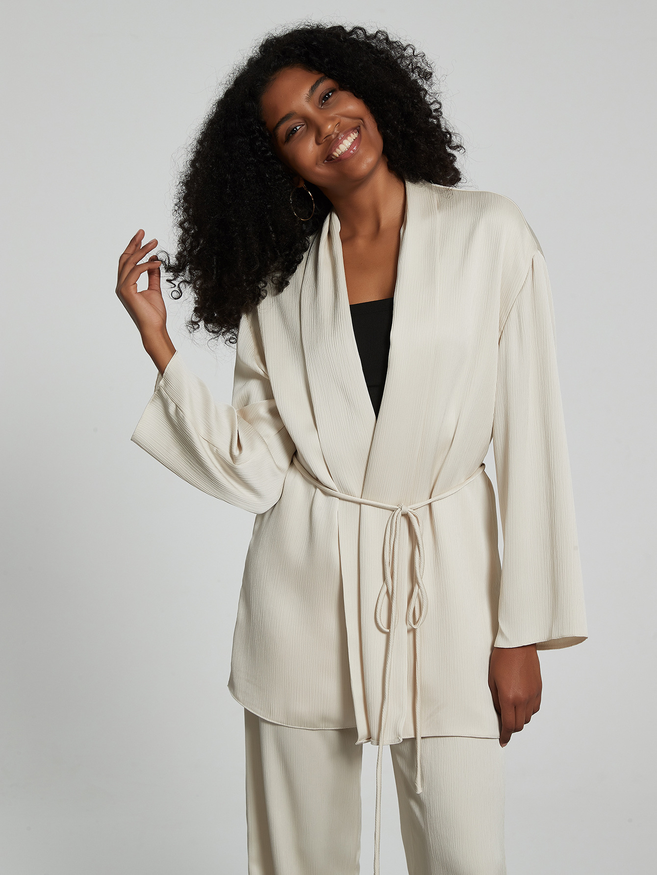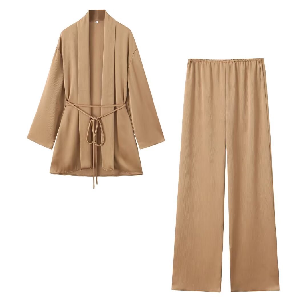 Women Clothing Two Piece Sets Collared Tied Tight Waist Pleated Coat Top Loose Trousers Autumn